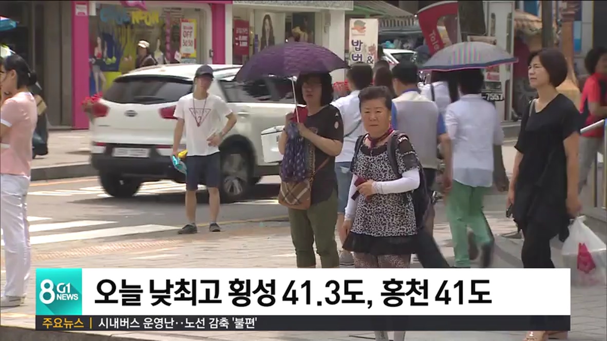 오늘(1일) 낮 최고기온은 횡성이 41.3도로 가장 높았고, 홍천과 화천이 각각 41도, 영월 39.9도로 그 뒤를 이었습니다.