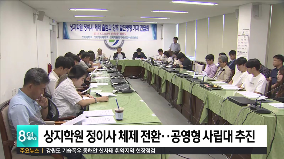 상지학원은 오늘(9일) '정이사 체제 출범과 향후 발전방향'이란 주제로 열린 기자간담회에서 상지대와 상지영서대학 통합을 추진하고, 공영형 사립대학 출범 준비에 본격적으로 나서기로 했다고 밝혔습니다.