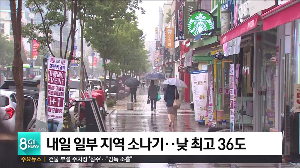 아침 최저기온은 영서지역이 20도에서 25도, 영동지역이 24도에서 25도의 분포를 보이겠고, 낮 최고기온은 29도에서 36도를 기록해 오늘보다 높거나 비슷하겠습니다.