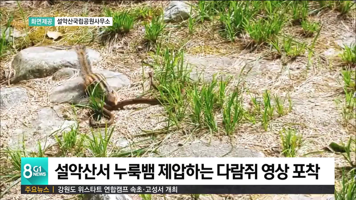 설악산국립공원사무소는 직원이 백담 탐방안내소에서 뱀 먹잇감으로 알려진 다람쥐가 치열한 싸움 끝에 누룩뱀을 물어뜯어 쫓아내는 진기한 장면을 촬영했다고 밝혔습니다.