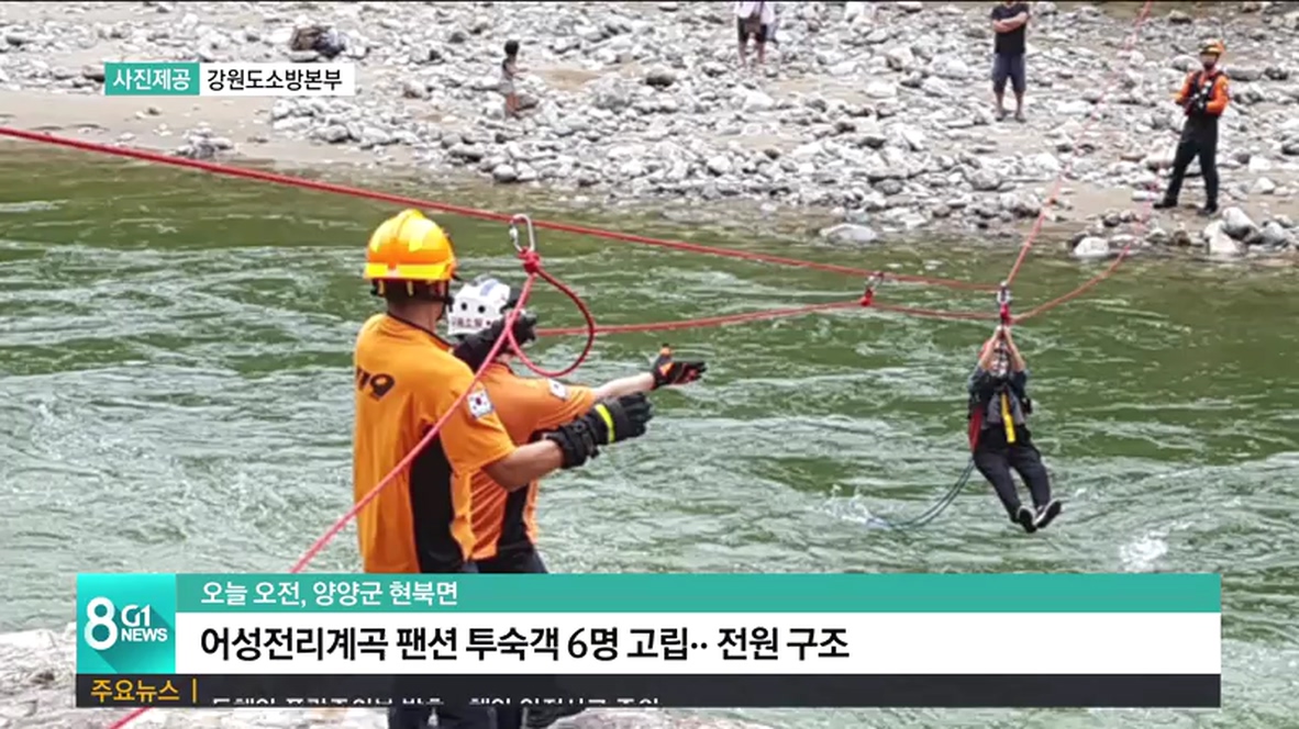 오늘 오전 9시 36분쯤 양양군 현북면 어성전리 계곡에서, 펜션 투숙객 46살 박모씨 등 6명이 불어난 물에 고립됐습니다.