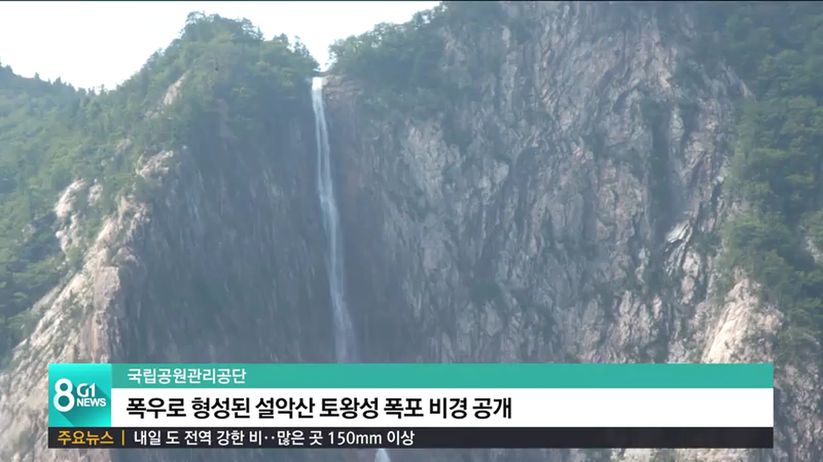 국립공원관리공단은 토왕성 폭포는 수량이 적어 여름철 비가 많이 내린 뒤 2~3일 가량만 폭포를 감상할 수 있는데, 최근 많은 비로 폭포가 형성됐다며 비경을 공개했습니다.