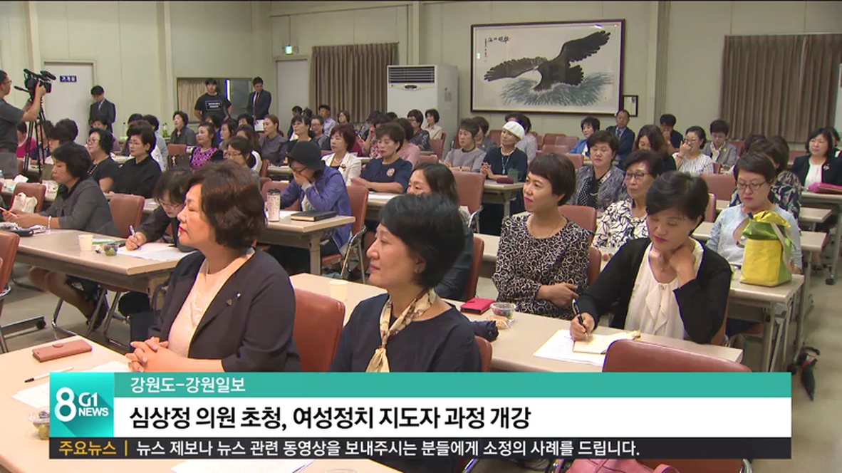 강원도와 강원일보는 도내 여성 정치 지도자들이 참석한 가운데, 정의당 심상정 의원을 초청해, 우리나라 정치 현주소와 정치가 삶에 미치는 영향, 여성의 사회참여 확대 등을 주제로 '2018 강원 여성정치 지도자 과정' 개강식을 개최했습니다.