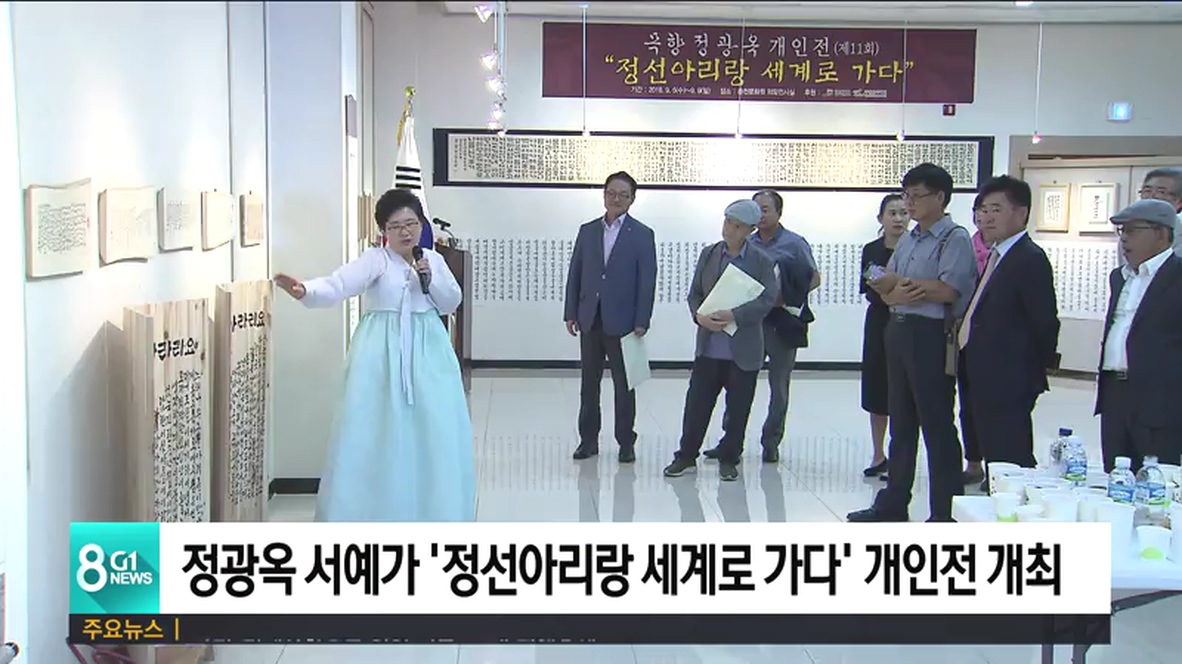 강원여성서예협회 이사장인 목향 정광옥 서예가의 개인전 '정선아리랑 세계로 가다'가 오늘, 춘천문화원 의암전시실에서 개막해, 오는 9일까지 열립니다.