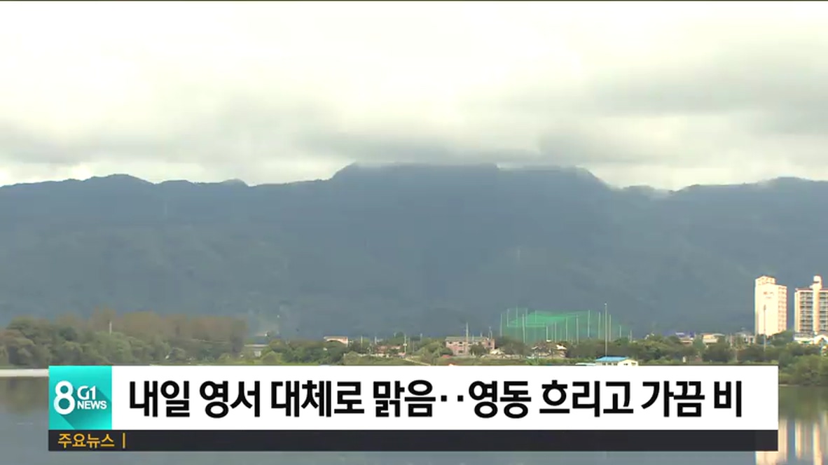 내일 도내 영서지역은 대체로 맑다가 오후부터 가끔 구름 많겠고, 영동지역은 대체로 흐리고 오전부터 가끔 비가 오는 곳이 있겠습니다.