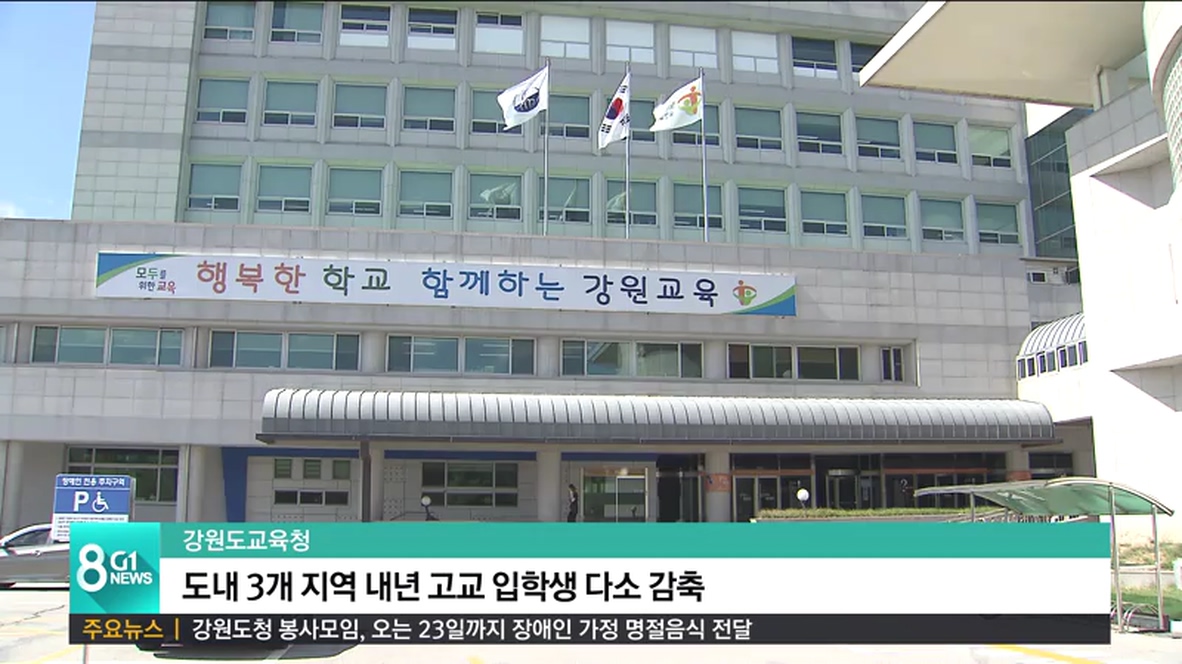 강원도교육청은 올해 강원도내 고등학교 입학을 앞둔 중학교 3학년 학생들이 전년보다 3천700여명 줄어 강원도내 평준화지역 22개 고등학교의 2019학년도 입학정원을 전년 대비 106명 감소한 5420명으로 확정했습니다.