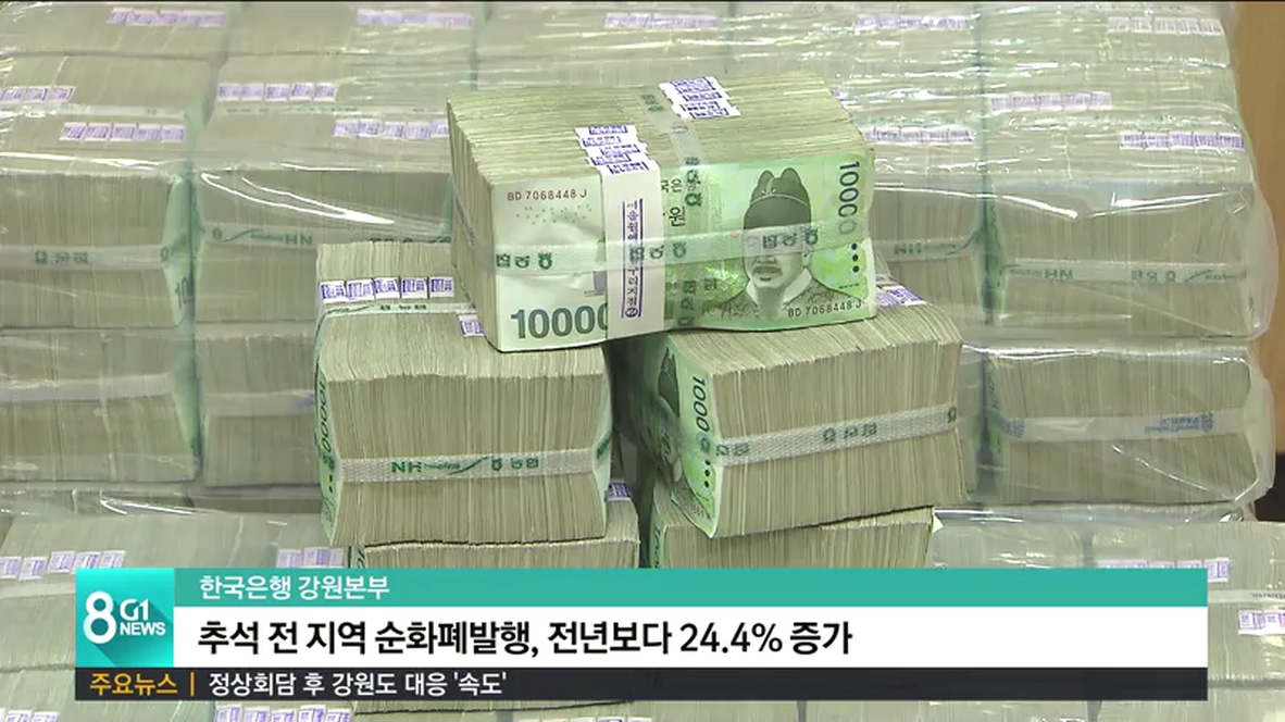 추석을 앞두고 강원지역에 순발행된 화폐 규모가 지난해 추석보다 20% 넘게 증가한 것으로 나타났습니다.