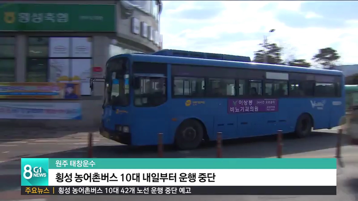 태창운수는 "올 들어 11억 2천만원 상당의 손실이 예상되지만, 횡성군의 지원액은 5억 6천만원에 불과하다"며 "차량 10대에 대한 최소한의 운영비 보전이 이뤄지지 않으면 내일(22일)부터 농어촌버스 10대 42개 노선에 대한 운행을 중단하겠다"고 밝혔습니다.