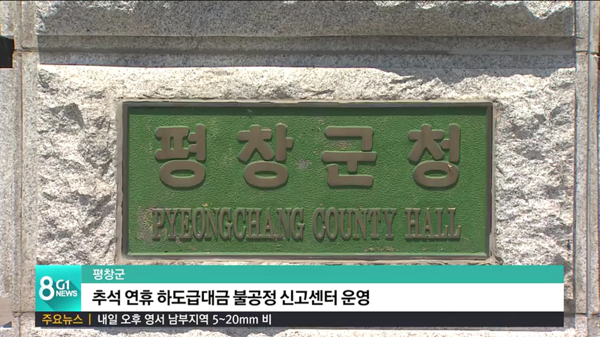 평창군이 추석 명절을 맞아 연휴기간인 오늘(22일)부터 26일까지 5일동안 하도급 대금 불공정행위 신고센터를 운영합니다.