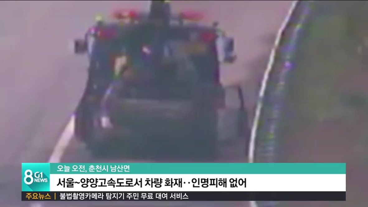 오늘 오전 10시 20분쯤 춘천시 남산면 서울~양양고속도로 서울방면 53.6㎞ 지점에서 46살 김모씨가 몰던 모하비 SUV차량에서 불이 나, 30여분 만에 꺼졌습니다.