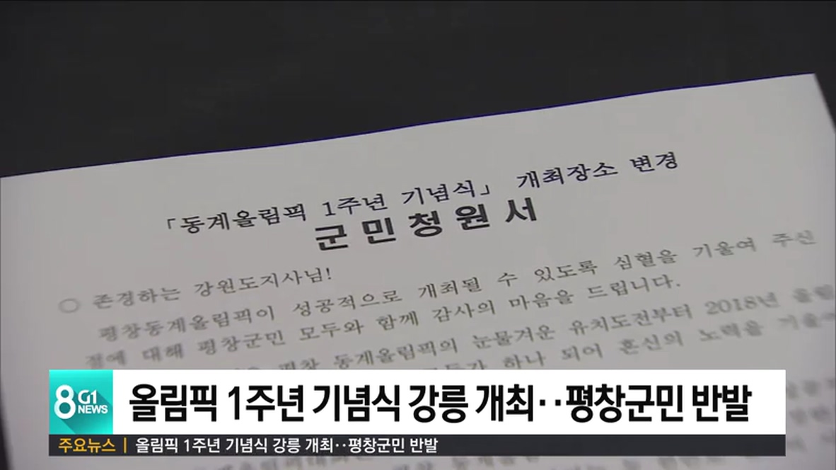 평창군번영회는 강원도에 청원서를 보내 "기념식을 강릉에서 개최하는 것은 올림픽 유치를 위해 20여년 동안 공들인 평창군민의 노력을 무시하는 결정"이라며 "올림픽 주개최지면서 남북평화의 상징인 평창에서 1주년 행사를 개최하는 것이 마땅하다"고 주장했습니다.