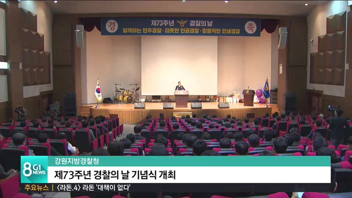 제73주년 경찰의 날 기념식이 오늘 오후 강원지방경찰청에서 경찰관과 의경, 재향경우회 관계자 등 400여명이 참석한 가운데 열렸습니다.