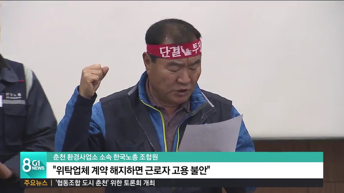 한국노총 춘천시 환경사업소지부는 오늘 신동면 혈동리 환경사업소에서 기자회견을 열고, '춘천시가 환경사업소 소속 근로자들의 처우를 개선하기는 커녕, 어떠한 협의 과정도 없이 민간 위탁 업체와의 계약 해지 등을 검토하며 근로자들의 고용 불안만 부추기고 있다'고 주장했습니다.