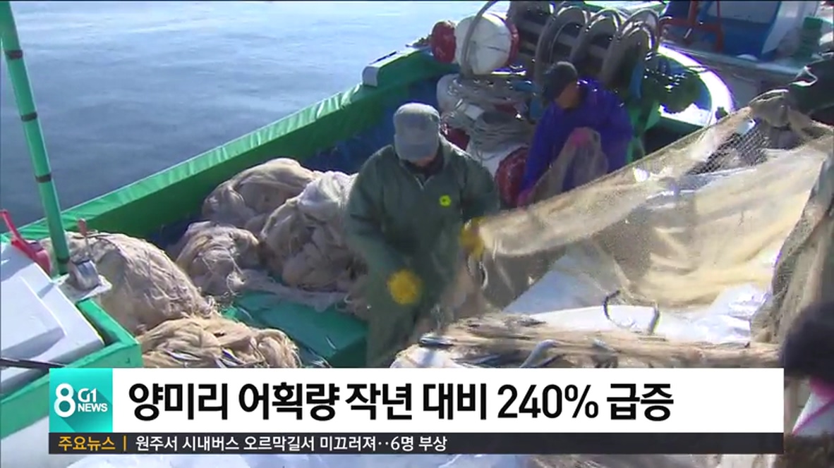 강원도 환동해본부는 지난달 말부터 본격적인 조업이 시작된 양미리가 지난 12일까지 620t 어획돼 지난해 같은 기간보다 240% 증가했다고 밝혔습니다.