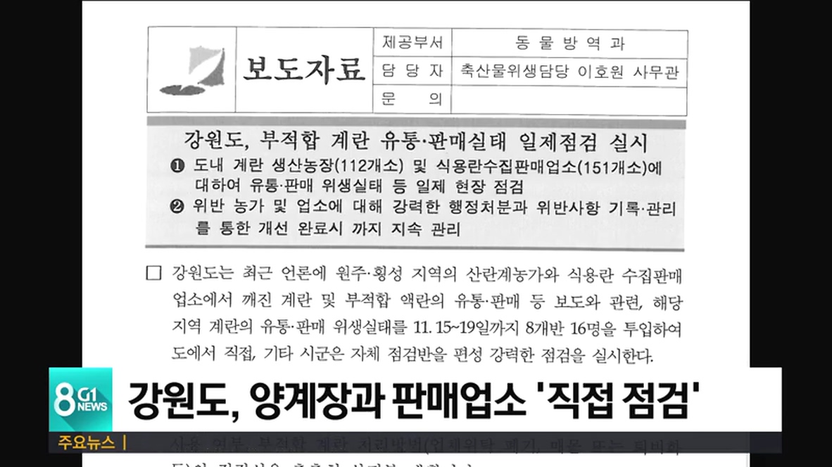 강원도는 오는 19일까지 원주와 횡성지역 양계장과 식용란 수집 판매업소를 대상으로 직접 8개반 16명을 투입해 강력한 점검을 벌인다고 밝혔습니다.