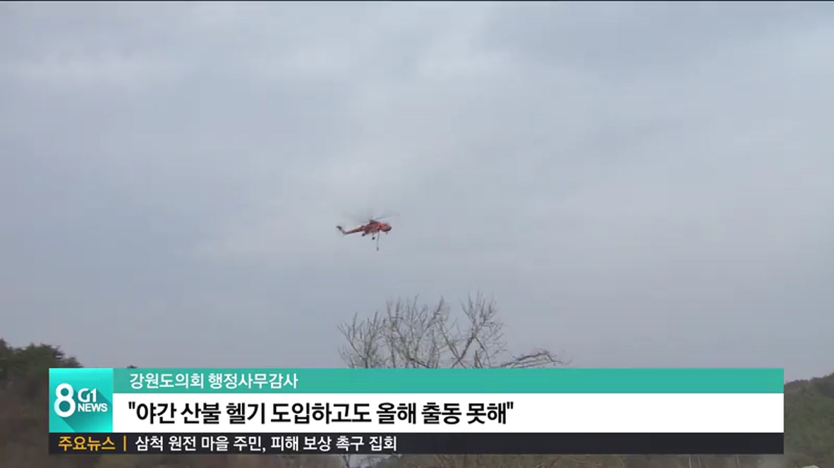 오늘 열린 강원도의회 녹색국 행정사무감사에서 김정중 의원은 야간 산불 헬기가 도입됐지만, 항공안전법에 따라 주간에 산불이 발생해 야간까지 지속된 경우에만 야간에 헬기가 출동할 수 있는데 올해는 야간에 산불이 발생한 경우만 있어 사용하지 못했다고 지적했습니다.