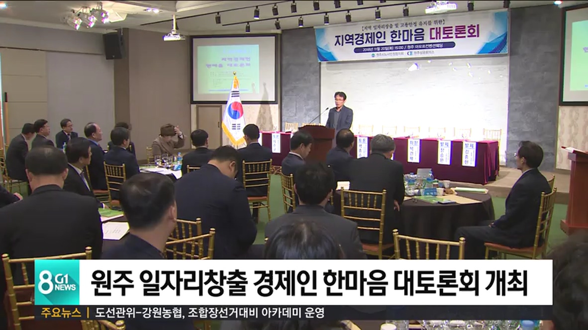원주 지역일자리 창출과 고용안정을 위한 지역 경제인 한마음 대토론회가 오늘 원주 아모르 컨벤션웨딩에서 지역 경제인 등 100여명이 참석한 가운데 열렸습니다.
