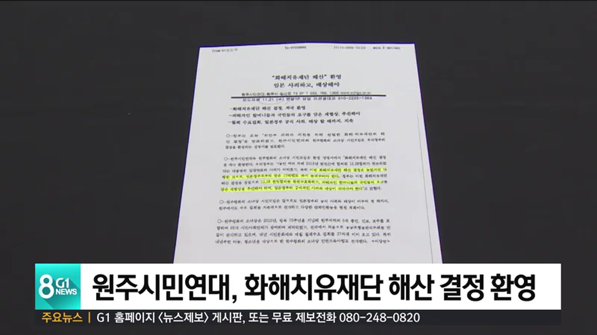 원주시민연대와 원주평화의 소녀상 시민모임은 오늘(21일) 성명을 내고, 정부가 한일 위안부 합의에 따라 설립한 화해치유재단 해산 결정을 환영했습니다.