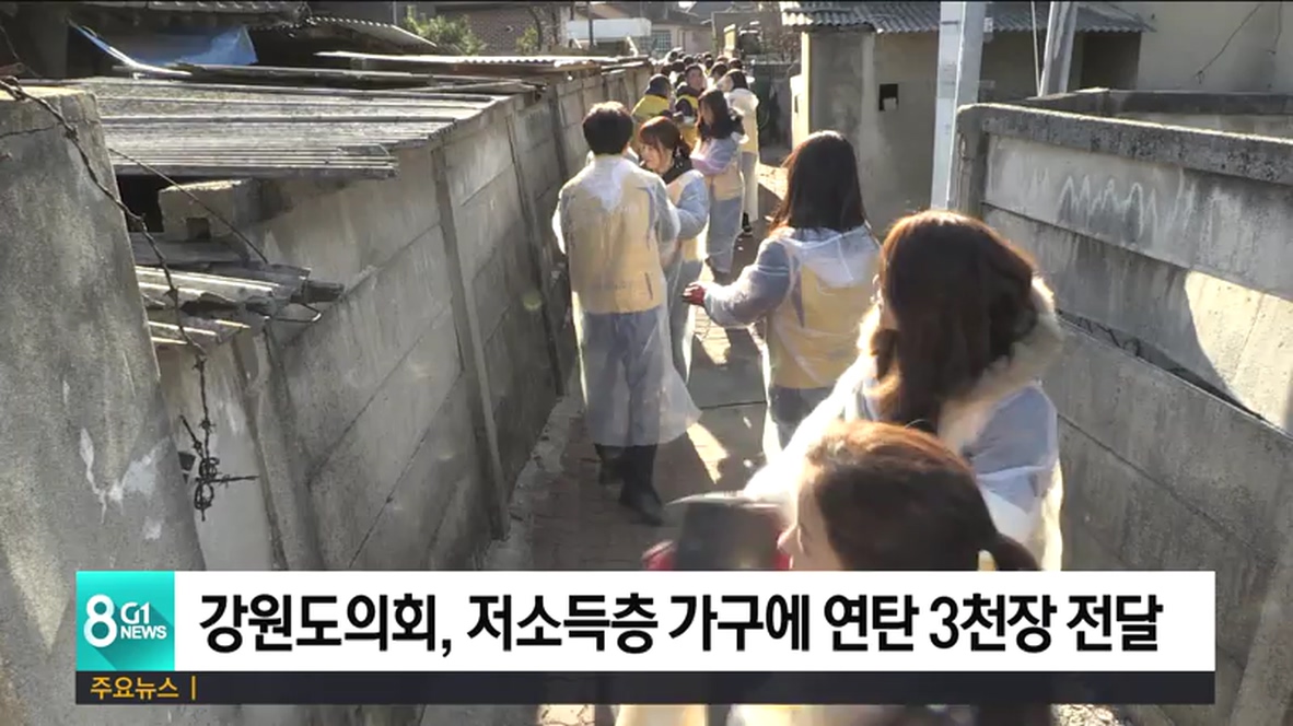 오늘 강원도의원과 도의회사무처 다나눔 봉사단 등 100여명이 춘천시 후평동 저소득층 가구에 연탄 3천장과 생필품 등을 전달했습니다.
