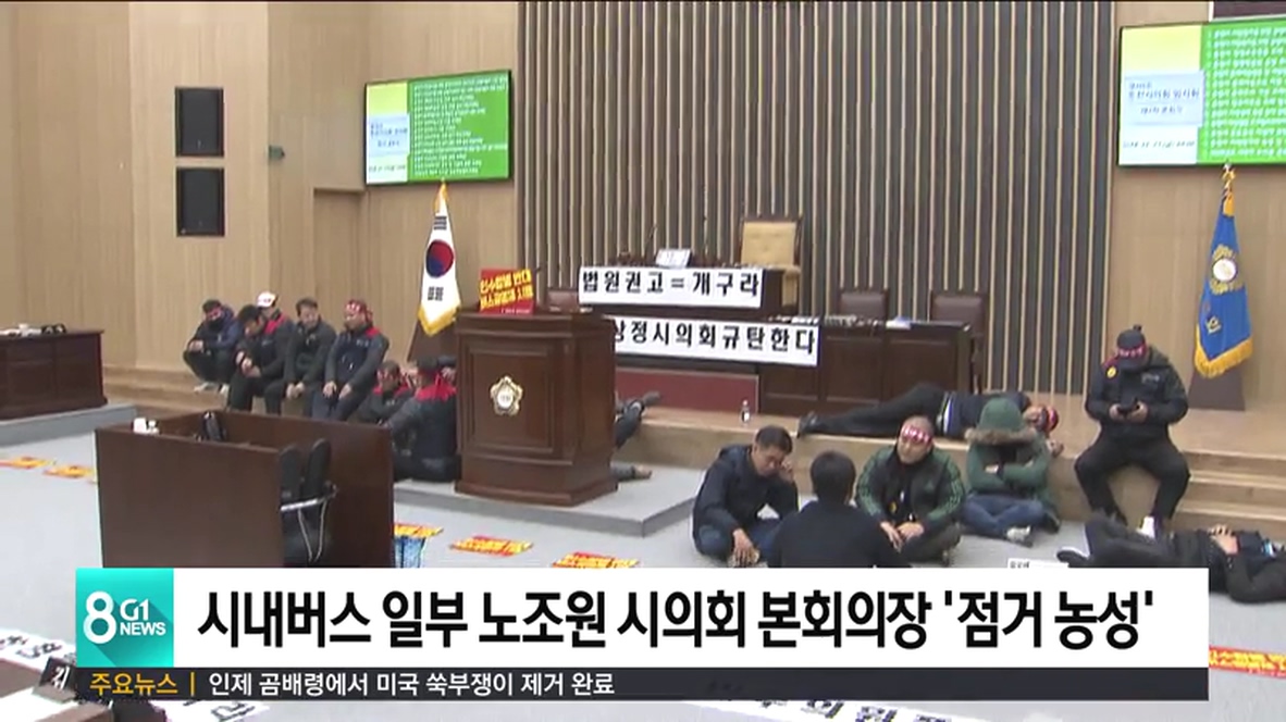 오늘 열린 춘천시의회 임시회 본회의에서 춘천 대동.대한운수 일부 노조원들이 회의 시작 직전, 본회의장을 점거해 농성을 벌였습니다.