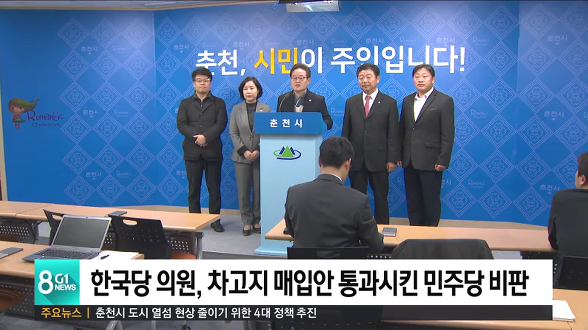 춘천시의회 자유한국당 소속 의원들은 오늘 춘천시청에서 기자회견을 열고, "시의회에서 이미 한 차례 부결된 버스 차고지 매입안에 대해, 집행부를 견제하고 감시해야 할 더불어민주당 시의원들이 시장과 같은 당이라는 이유로 제대로 된 검증도 없이 부결 2주 만에 가결시켰다"고 비판했습니다.