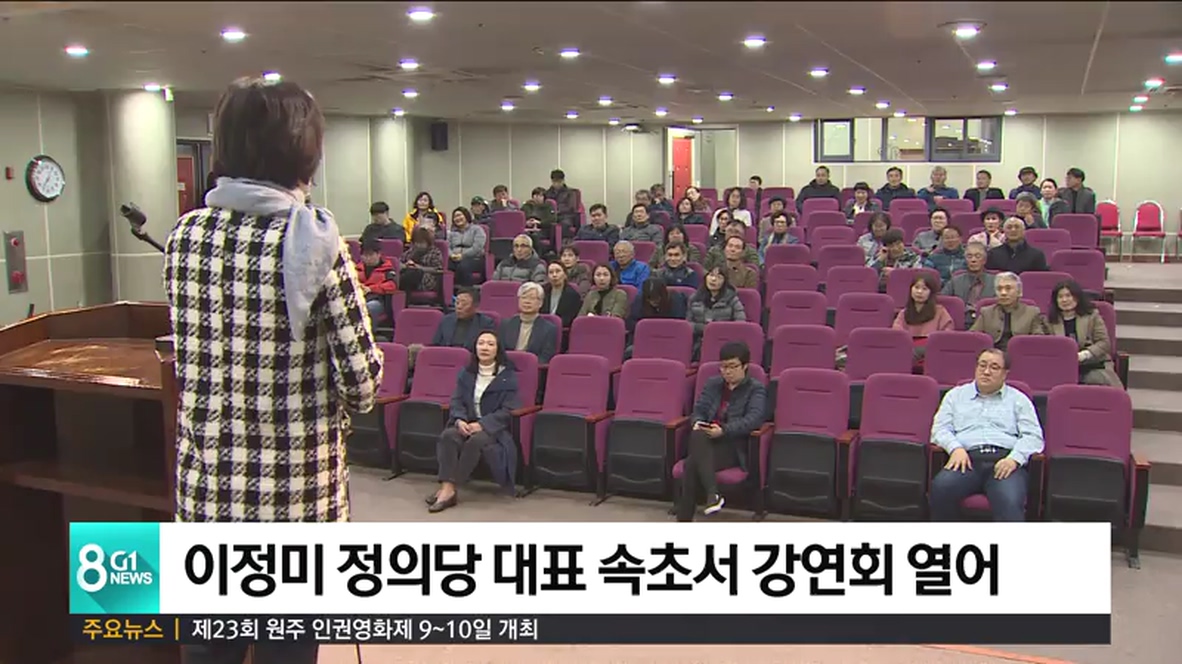 정의당 이정미 대표가 속초시 근로자종합사회복지관 대강당에서 속초시민들을 대상으로 강연회를 열었습니다.