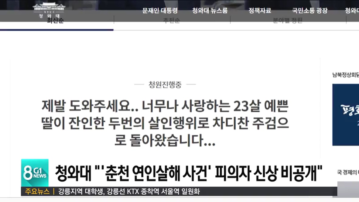 여자친구를 목 졸라 살해한 후 주검까지 훼손한 이른바 '춘천 연인살해 사건'의 피의자 얼굴과 신상정보 공개, 강력 처벌을 촉구하는 청와대 국민청원에 대해, 청와대 관계자가 답변했습니다.