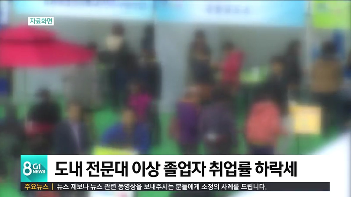 도내 평균 취업률은 66.7%에서 65%로 1.7% 포인트 떨어져 전국 평균 보다 하락세가 컸으며, 전국 17개 시.도 중 여섯번째로 낮은 것으로 조사됐습니다.
