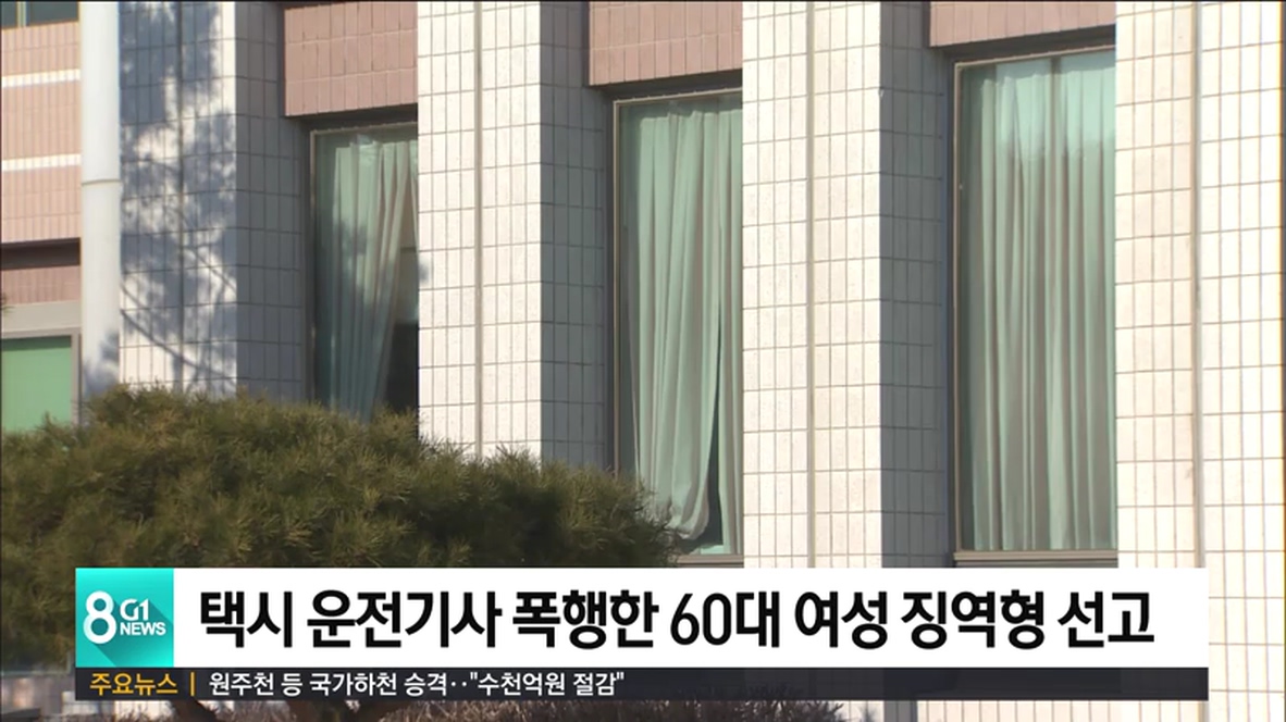 춘천지법 강릉지원 형사1단독 이상원 부장판사는 택시 운전기사를 폭행한 혐의로 기소된 62살 여성 강모씨에게 징역 8월에 집행유예 2년을 선고하고, 120시간의 사회봉사를 명령했습니다.