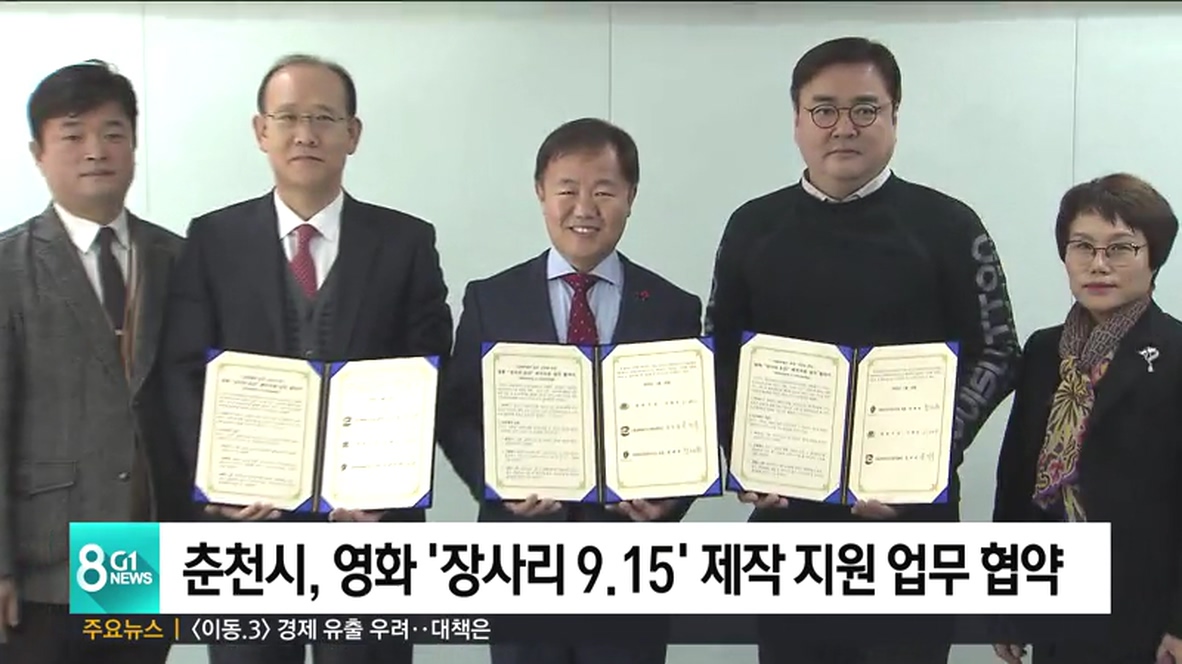 춘천시는 오늘(10일) 춘천시장 접견실에서 춘천바이오산업진흥원과 태원엔터테인먼트 등과 함께 영화 '장사리 9.15' 제작 지원을 위한 업무협약을 맺었습니다.