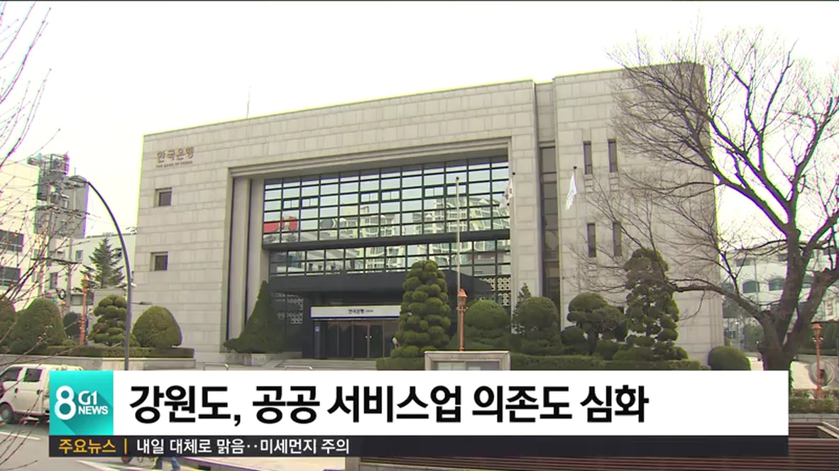 한국은행에 따르면, 2017년 도내 총부가가치 대비 서비스업의 비중이 전국 평균인 59.1%보다 10% 이상 높게 나타났고, 그 중에서도 공공행정과 국방, 사회보장 서비스업의 비중이 가장 높았던 것으로 집계됐습니다.
