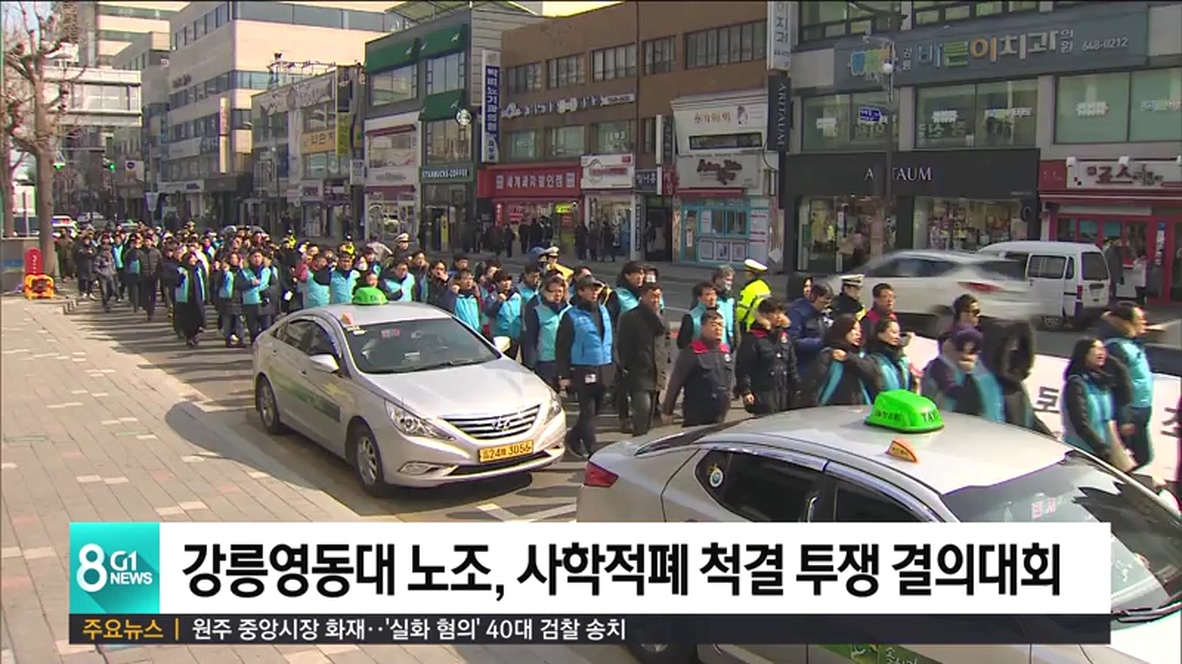 전국대학노동조합 강릉영동대학지부는 오늘 강릉 월화거리에서 사학적폐 척결을 위한 투쟁 결의 대회를 개최했습니다.