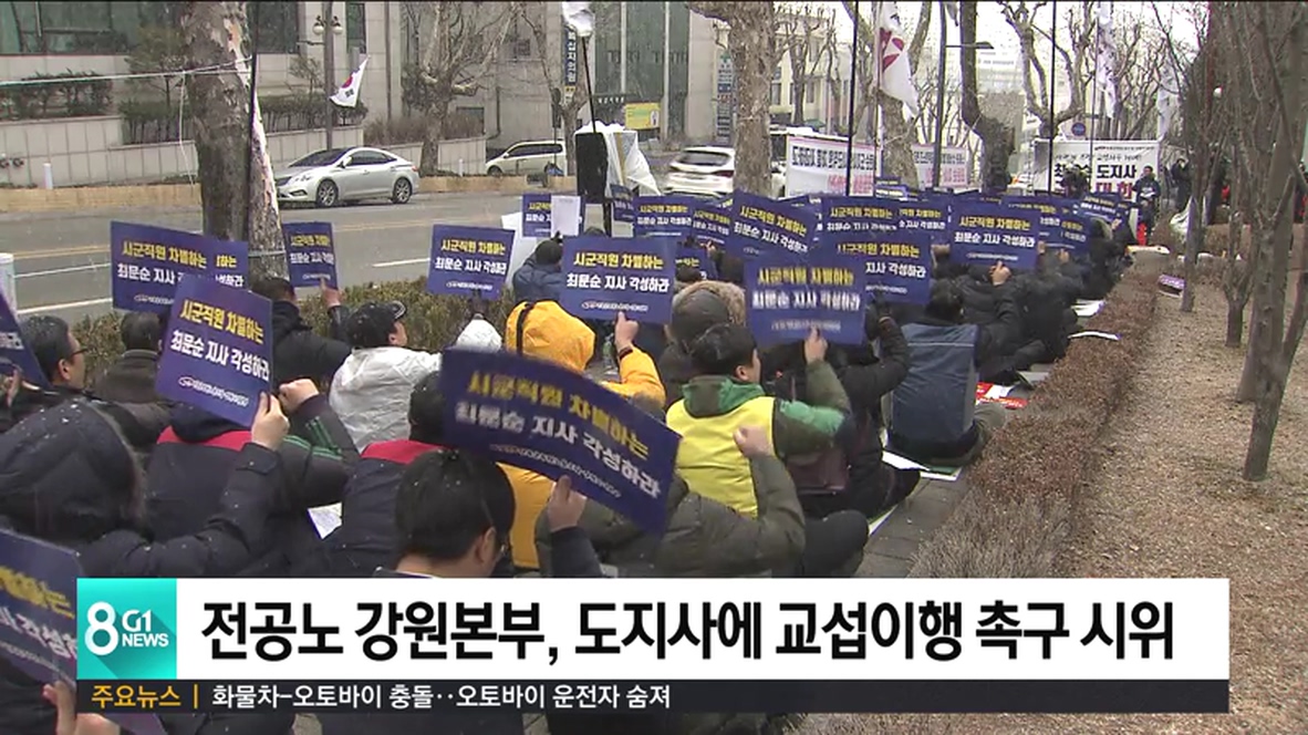 민주노총 전국공무원노동조합 강원지역본부는 오늘(15일) 강원도청에서 집회를 열고, 최문순 도지사에게 교섭을 이행할 것을 촉구했습니다.