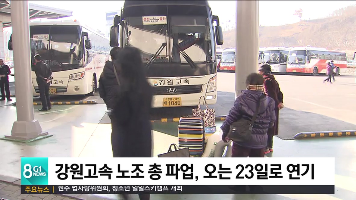 강원고속 노조는 당초 예정됐던 2차 조정이 오는 22일 오후 2시로 연기됨에 따라, 총파업 예정일을 오는 23일로 연기했다고 밝혔습니다.