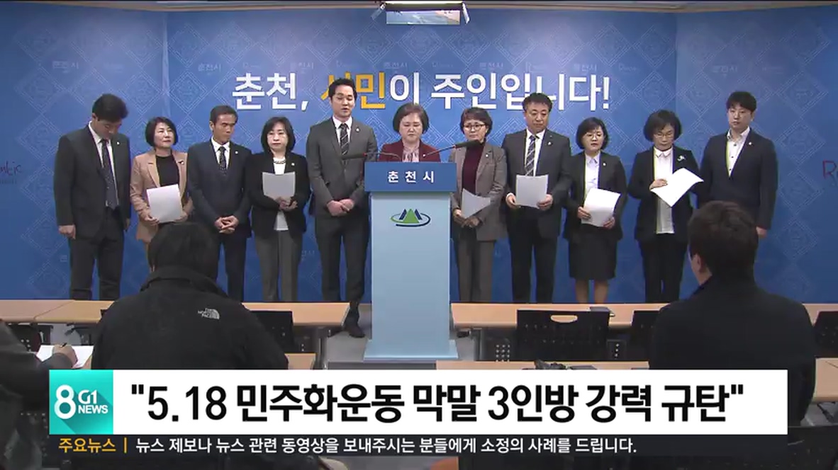 춘천시의회 더불어민주당 의원들은 오늘 춘천시청에서 기자회견을 열고, 5.18 민주화운동을 폄훼하고 왜곡한 자유한국당 김진태, 김순례, 이종명 의원을 강력 규탄하고, 책임있는 사죄와 당 차원의 조치를 촉구했습니다.