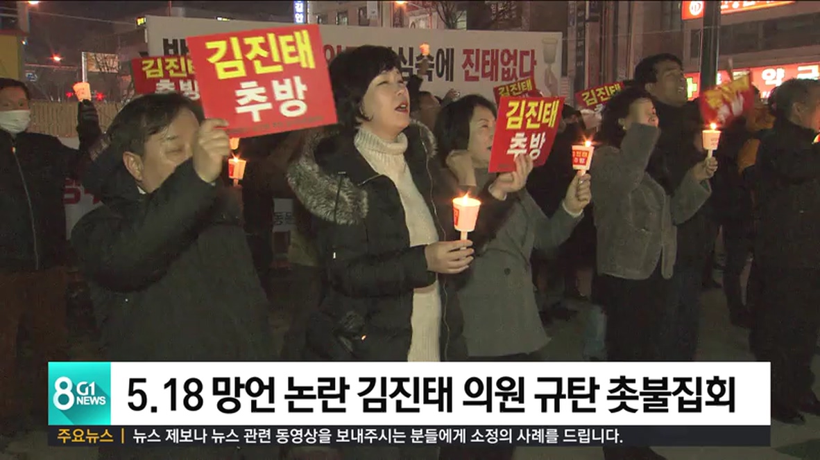 도내 54개 단체로 구성된 '춘천 망신 김진태 추방 범시민운동본부'는 오늘 춘천시 석사동 김의원 사무실 앞에서 촛불 집회를 열고, 김 의원이 5.18 망언 논란에 대해 국민들에게 사죄하고, 의원직을 사퇴해야 한다고 주장했습니다.