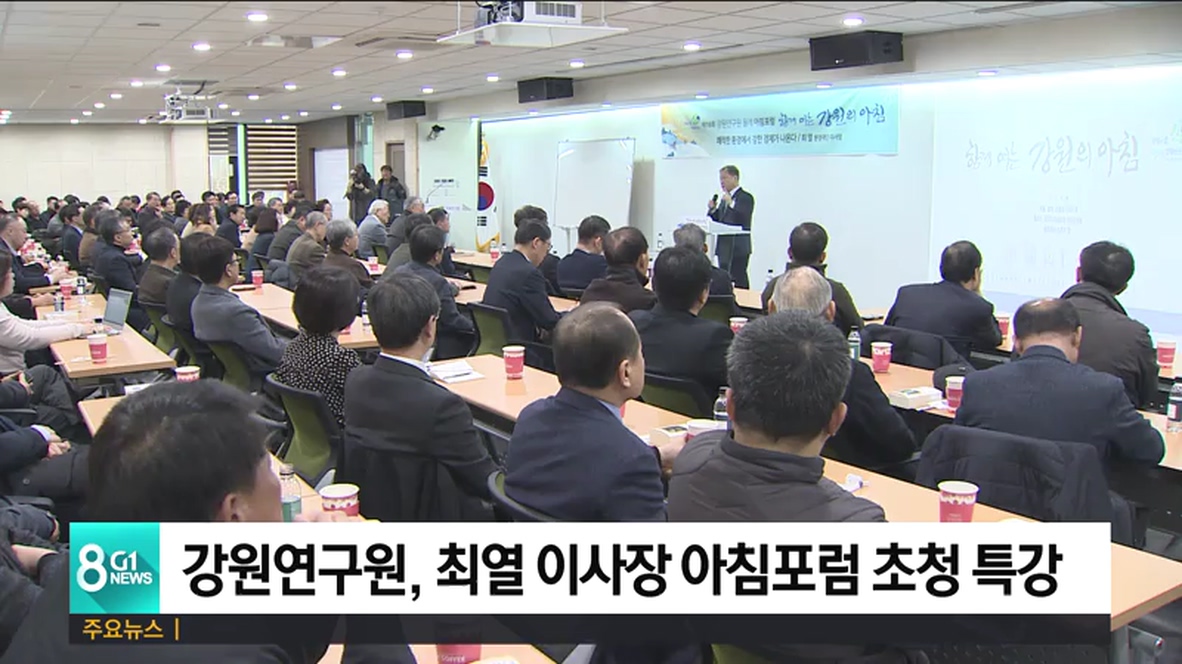 강원연구원은 오늘 대회의실에서 최열 환경재단 이사장을 초청해, '쾌적한 환경에서 강한 경제가 나온다'를 주제로 제 18회 월례 아침포럼을 개최했습니다.