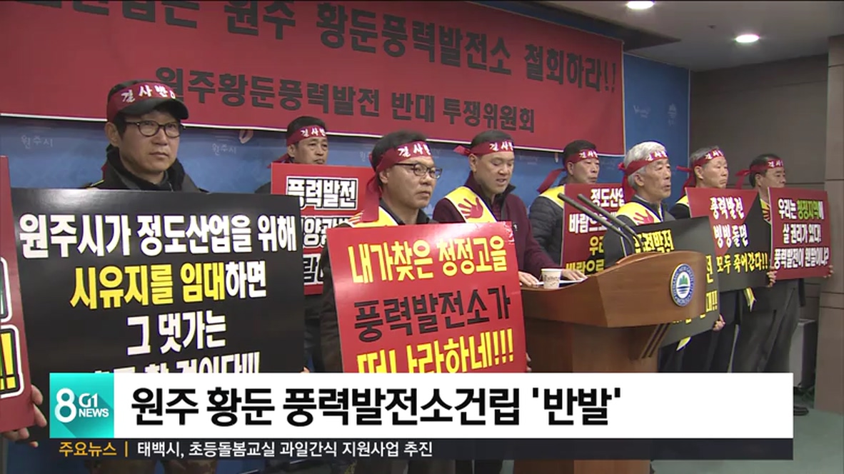 원주시 신림면과 영월군 무릉도원면, 충북 제천시 송악면 지역 주민들로 구성된 '원주 황둔 풍력발전소건립저지 투쟁위원회'는 오늘 원주시청 브리핑룸에서 기자회견을 열고, 산업자원부에 풍력발전사업 허가 철회를 촉구했습니다.