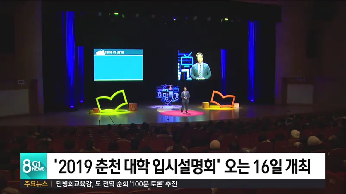 춘천시와 EBS, G1강원민방은 오는 16일 춘천문화예술회관에서 국영수 과목별 학습법과 달라진 2020학년도 입시제도에 대해 EBS 입시설명회 대표 강사 4명이 분석해주는 '2019 춘천 대학 입시설명회'를 개최한다고 밝혔습니다.