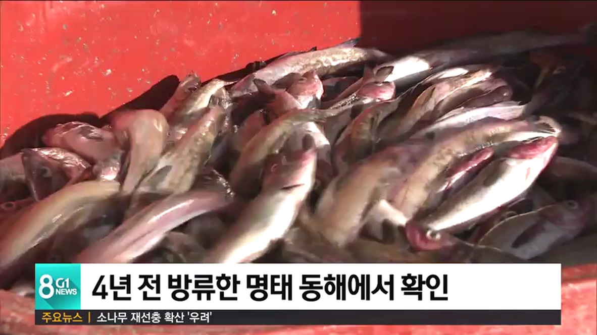 해양수산부는 최근 동해에서 잡은 명태의 유전자를 분석한 결과 7마리가 방류 명태로 확인됐으며, 크기 등을 생각하면 모두 2015년 12월 고성 앞바다에 방류한 개체로 추정된다고 밝혔습니다.