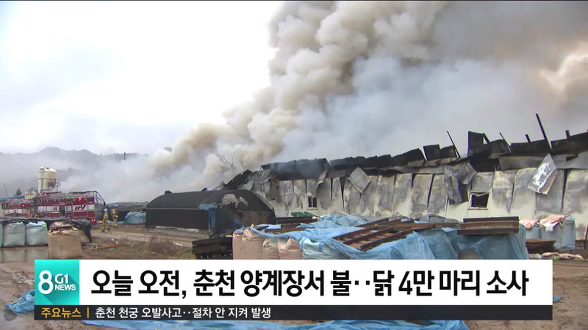 다행히, 인명 피해는 없었지만, 비닐하우스 2개 동이 불에 탔고, 닭 4만 마리가 소사했습니다.