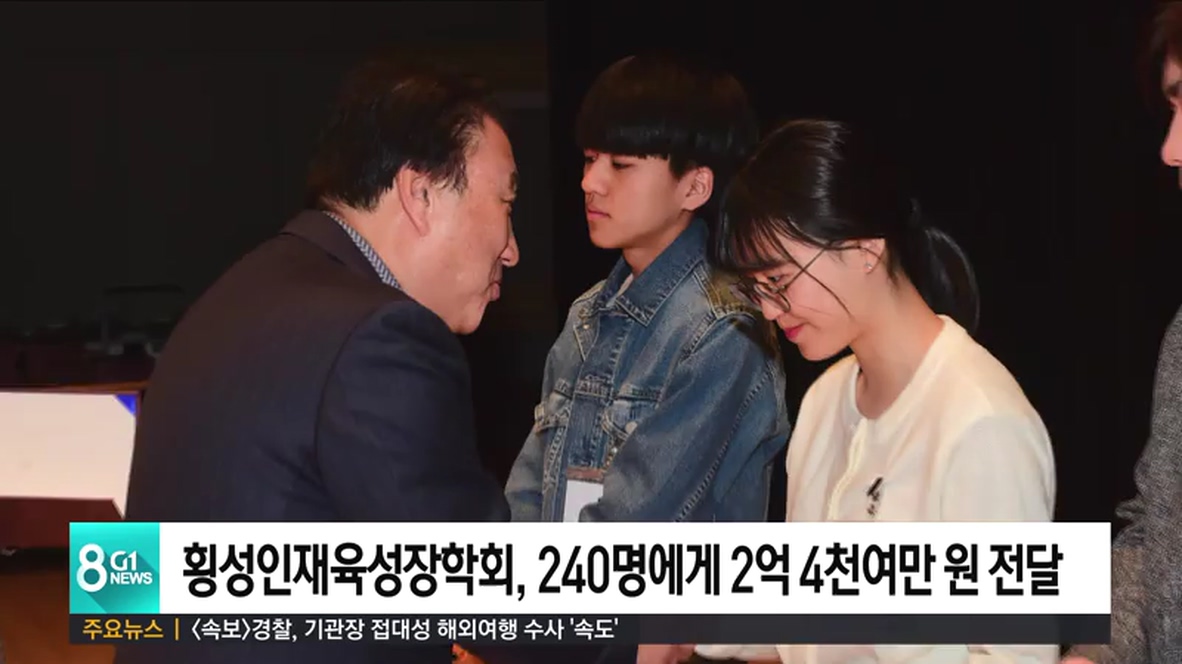 조창진 횡성인재육성장학회 이사장과 한규호 횡성군수 등이 참석한 가운데 열린 이번 행사에서는 성적 우수자와 예체능 특기생 등 모두 240명에게 2억 4천 280만원이 전달됐습니다.