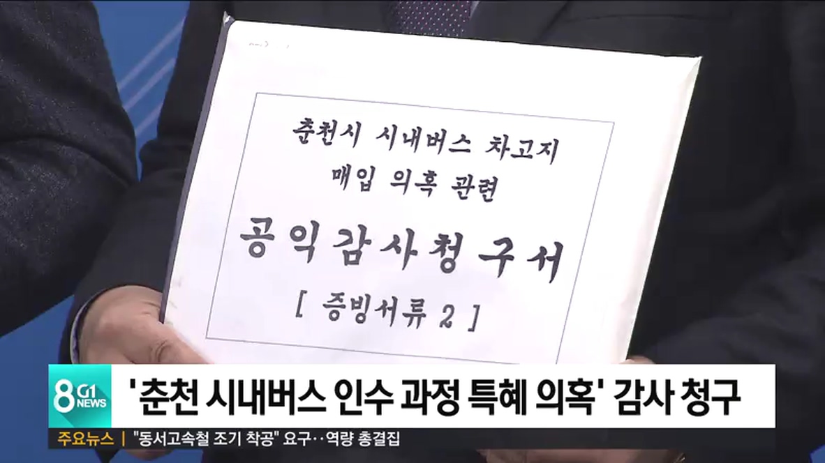 춘천시의회 소속 일부 의원들은 오늘, 설립된 지 한 달도 안 된 신생 협동조합이 80억원에 달하는 시내버스 업체를 인수하고, 이 과정에서 춘천시가 버스 차고지를 매입해 주는 등의 각종 특혜를 제공했다는 의혹에 대해 공익 감사를 해달라며 300명이 넘는 춘천시민 서명부를 감사원에 제출했습니다.