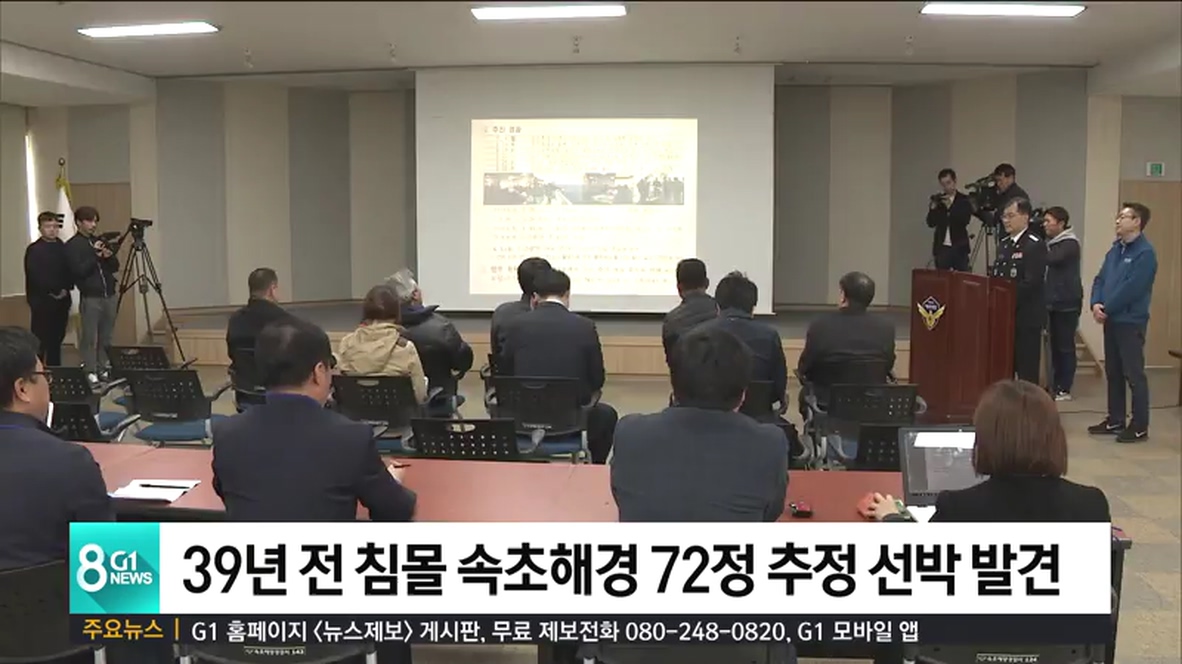 39년 전 고성군 거진 앞바다에서 침몰한 속초해경 60톤급 경비정인 72정으로 추정되는 선박이 발견됐습니다.