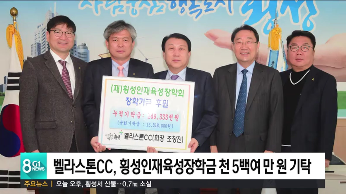 벨라스톤CC는 오늘, 횡성군청에서 장학금 기탁식을 열고, 횡성인재육성장학회 장학기금으로 천 518만원을 기탁했습니다.