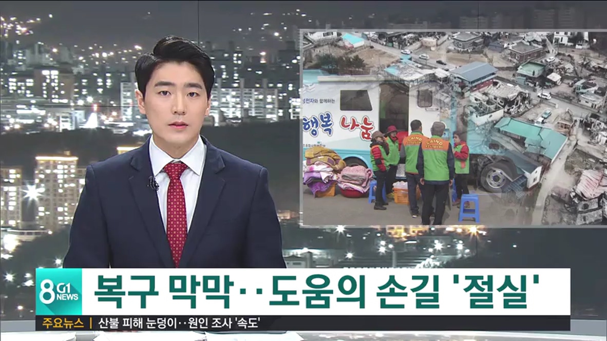 사상 유례없는 산불 피해를 입고 망연자실해 있는 강원도 피해지역 주민들에게 각계의 도움의 손길이 큰 힘이 되고 있습니다.