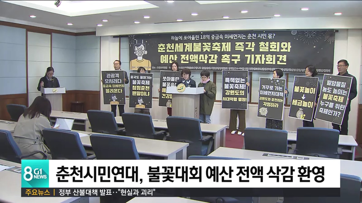 춘천시민연대는 세계불꽃축제의 경제적 타당성과 환경 문제, 안건 상정의 절차적 과정과 시의성에 대한 논의를 벌여 관련 예산 10억 원 전액을 삭감한 것은 올바른 판단이라고 밝혔습니다.
