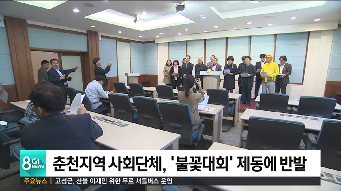 춘천시 근화동주민자치회와 이통장연합회 등 16개 사회단체는 공동 성명을 통해, "도의회가 침체된 지역 경기회복과 발전을 바라는 시민의 열망을 한순간에 짓밟았다"며 "최종 예산심의 과정에서 불꽃대회 예산을 전액 통과시켜야 한다"고 촉구했습니다.