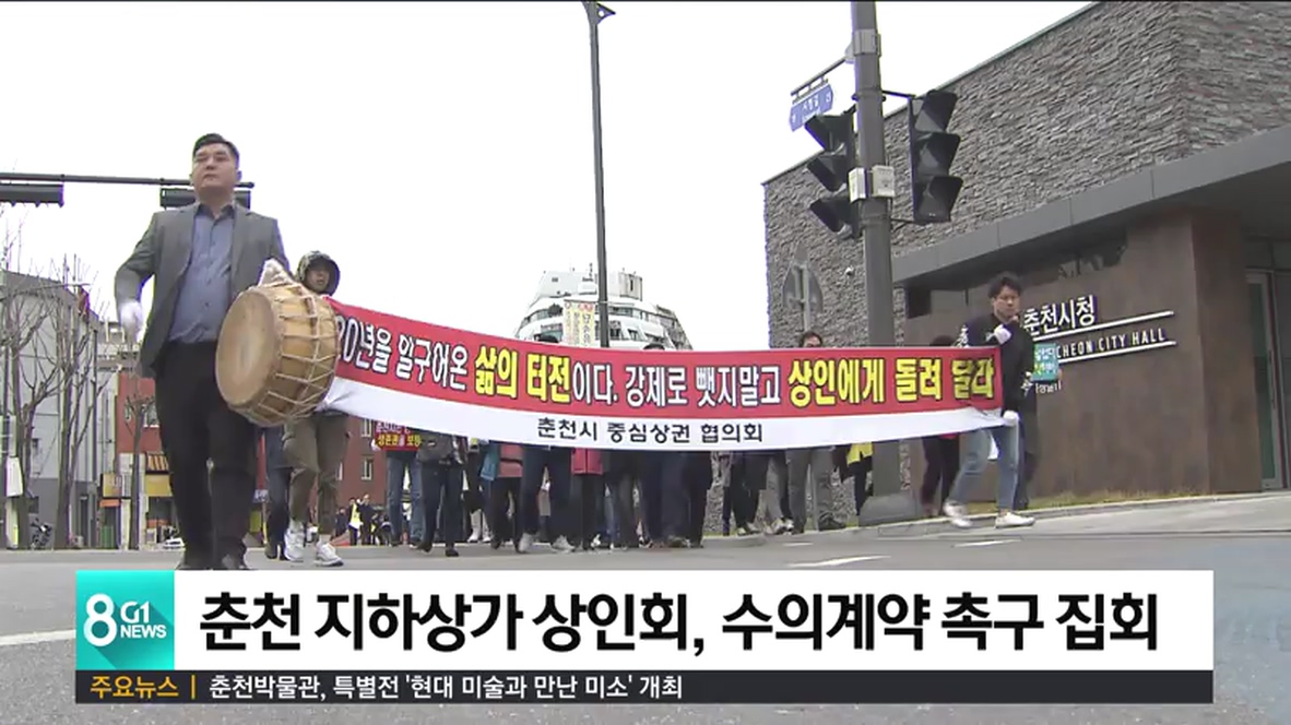 춘천 지하상가 상인회는 오늘(19일) 춘천시청 앞에서 춘천 지하상가의 수의계약을 촉구하는 시가행진을 벌였습니다.