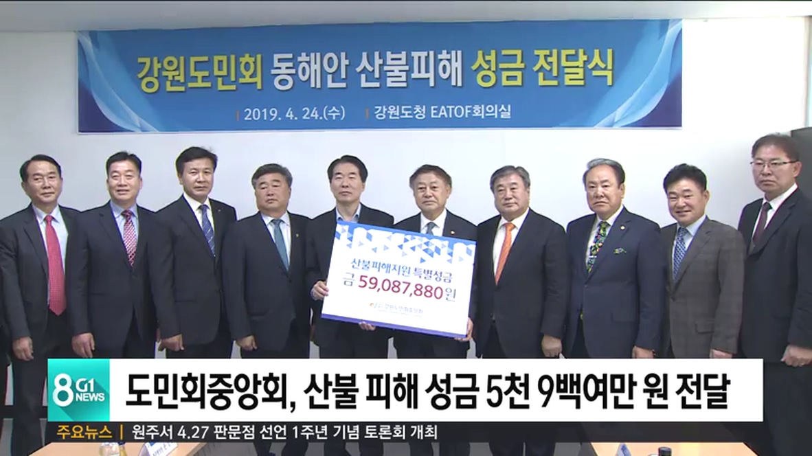 강원도민회중앙회 회장단은 오늘(24일) 강원연구원에서 김성호 강원도 행정부지사를 만나 산불 피해 성금 5천9백여 만 원을 전달했습니다.